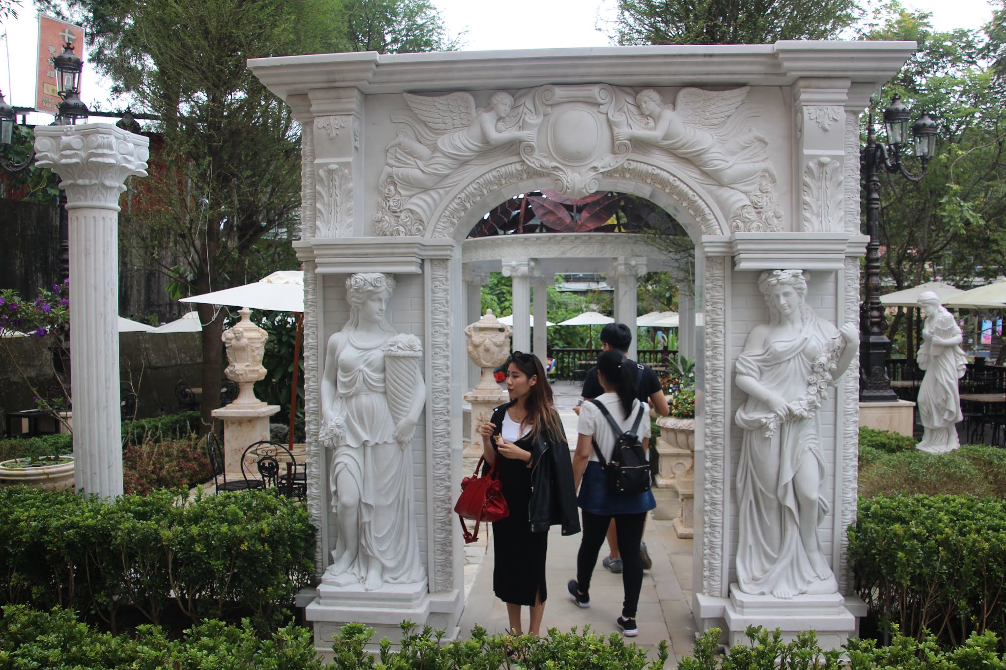 室外歐州風的花園陳設,讓不少遊客佇足於此,
